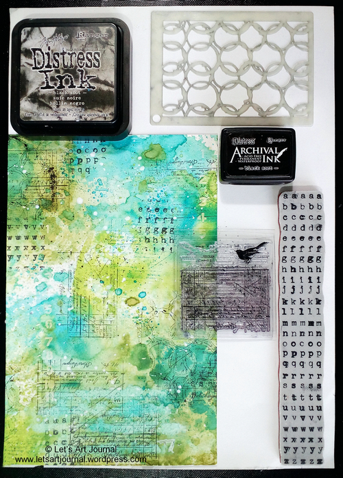 I used an Interlocking Circles stencil as a stamp by covering it with Black Soot Distress Ink and pressing it firmly onto the paper using a brayer. I also stamped a receipt stamp and a letter stamp using Black Soot Distress Archival Ink.